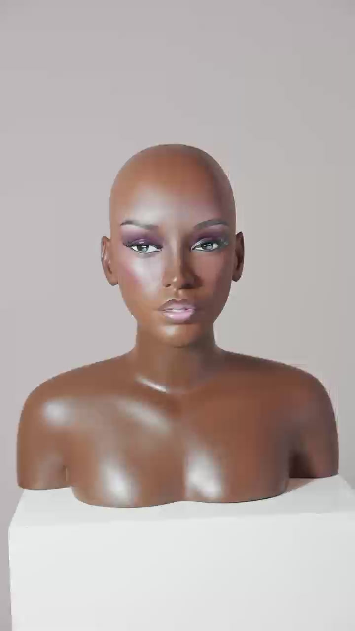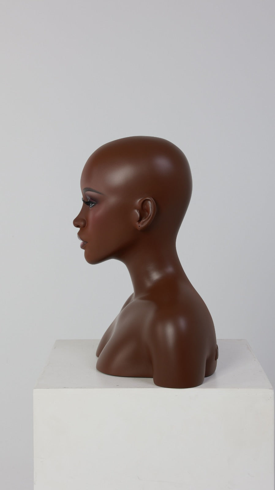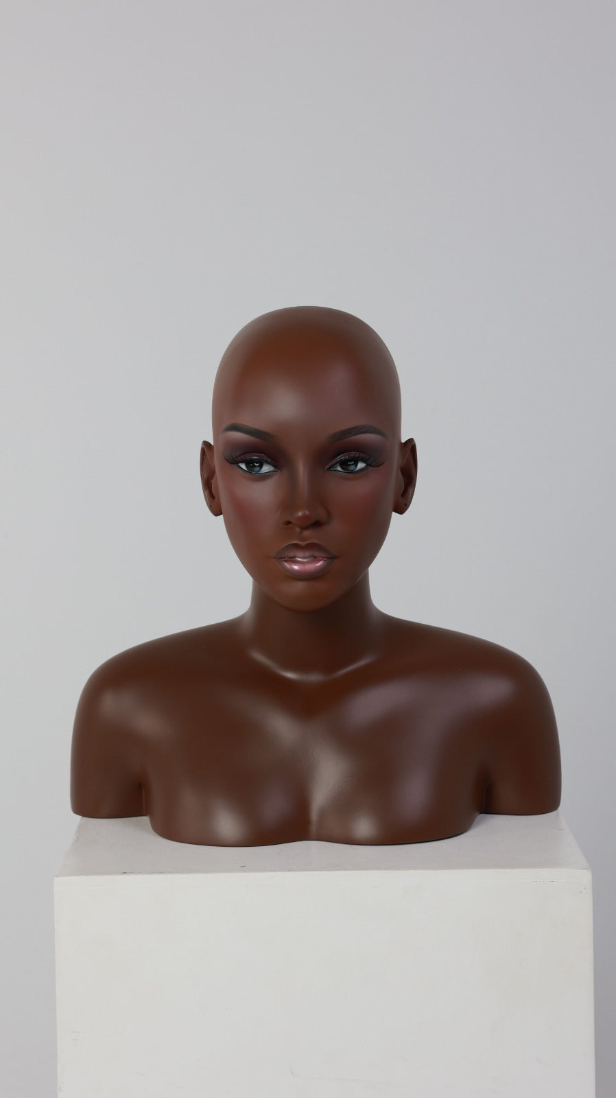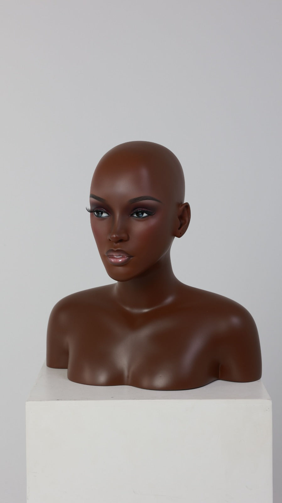 The oval face of this Nummie mannequin head lets her pull off any wig style, while her slender neck and sculpted clavicle display jewelry and scarves flawlessly. She’s also got pierced ears for earrings. Her arresting gaze, adorned with fluttery eyelashes, is sure to make her unforgettable as an eyewear model. With her audacious yet relatable spirit, she makes everything look good — and she knows it, too.